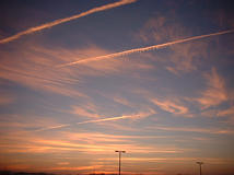 This beautiful display was captured at sunset also by Ed Donovan of Berry Shoals Intermediate School, on January 28th, 2002 in South Carolina. Note the delicate structure in the middle contrail, which results from local air motions induced by the airplane.